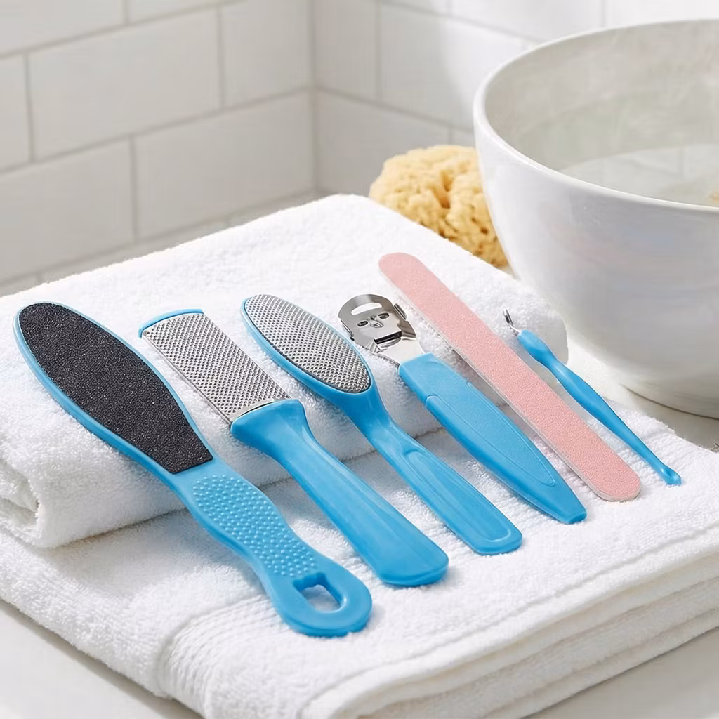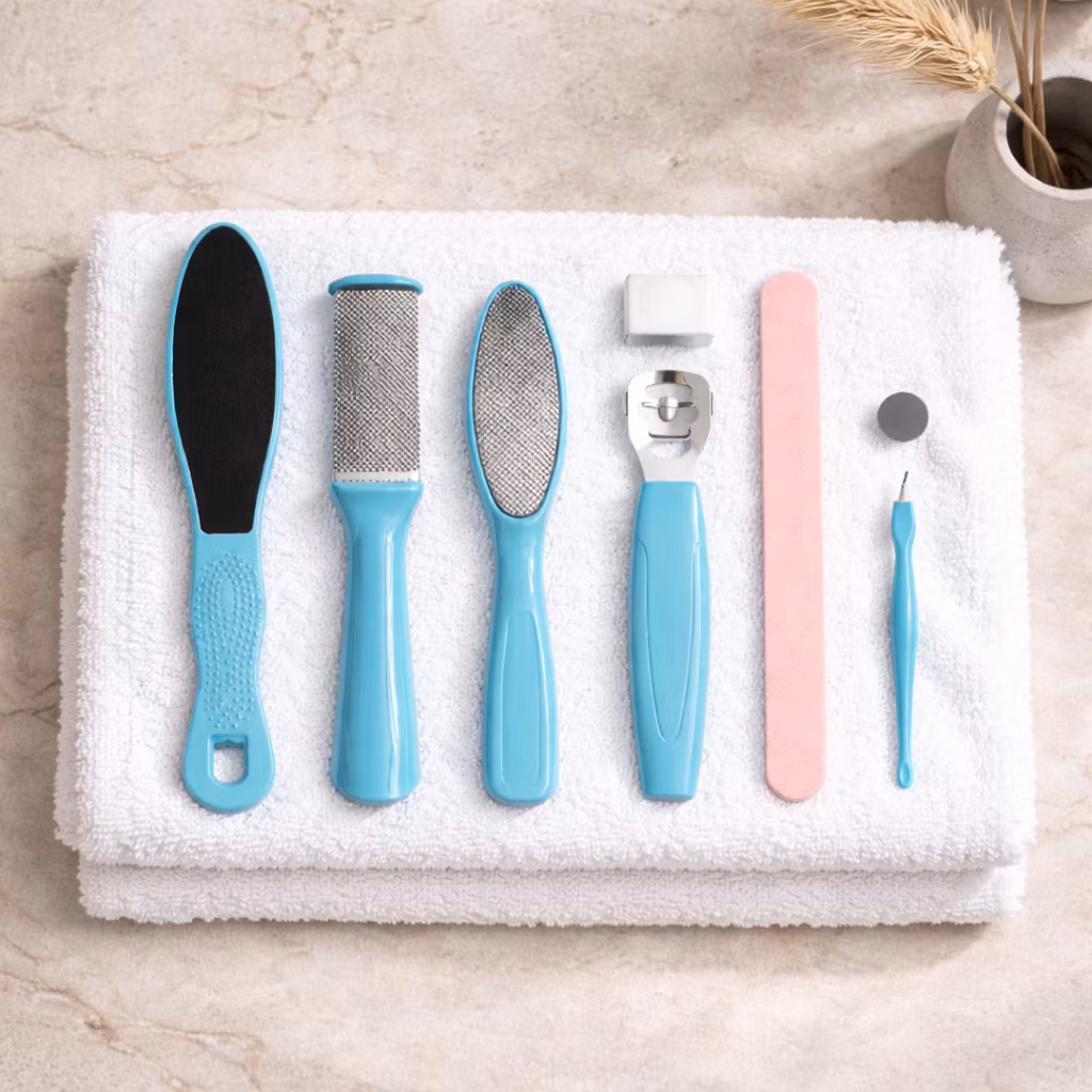 Kattava setti kuudella erilaisella työkalulla ja jalkaraspilla, joiden avulla jalkojen hoitaminen käy helposti ja mukavasti. Poista kovettunut ja kuollut iho sekä kovettumat jaloista helpolla tavalla. Sisältää jalkaraspin, jalkahöylän, kynsinauhaveitsen ja muita tarvikkeita jalkojenhoitoon.