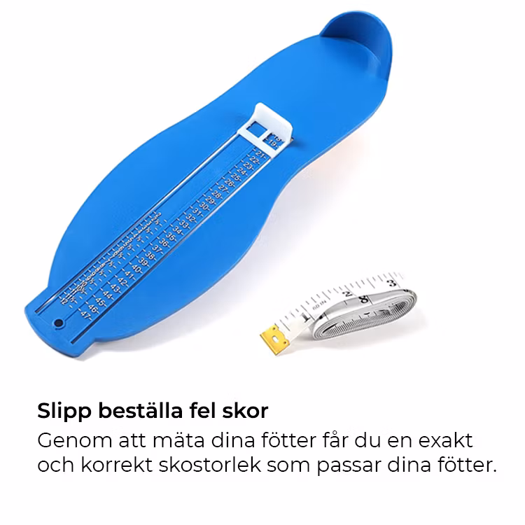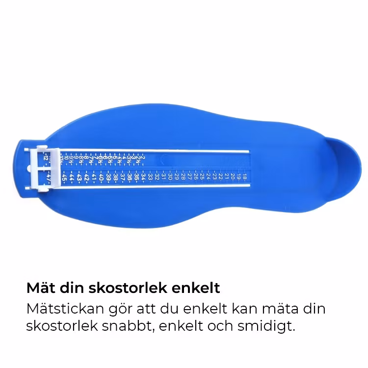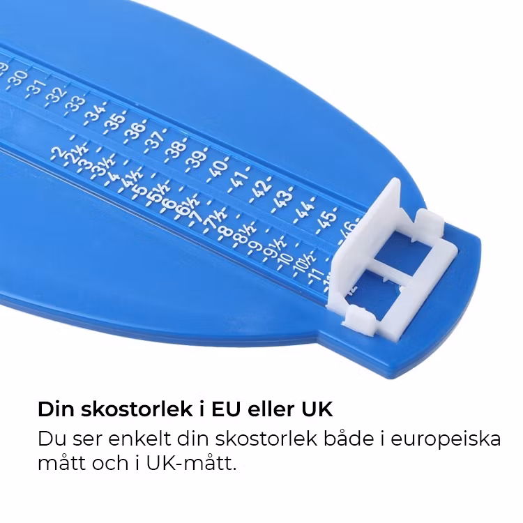 Vähennä väärän kengänkoon ostamisen riskiä käyttämällä tätä älykästä jalkamittaa. Mittatikun avulla mittaat jalkasi ja saat oikean kengänkokosi sekä eurooppalaisessa (EU) että brittiläisessä (UK) kengänkoossa.