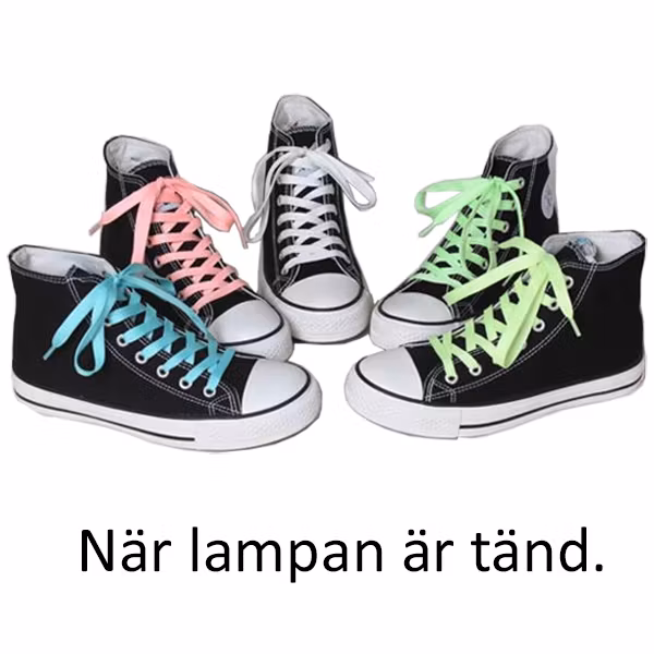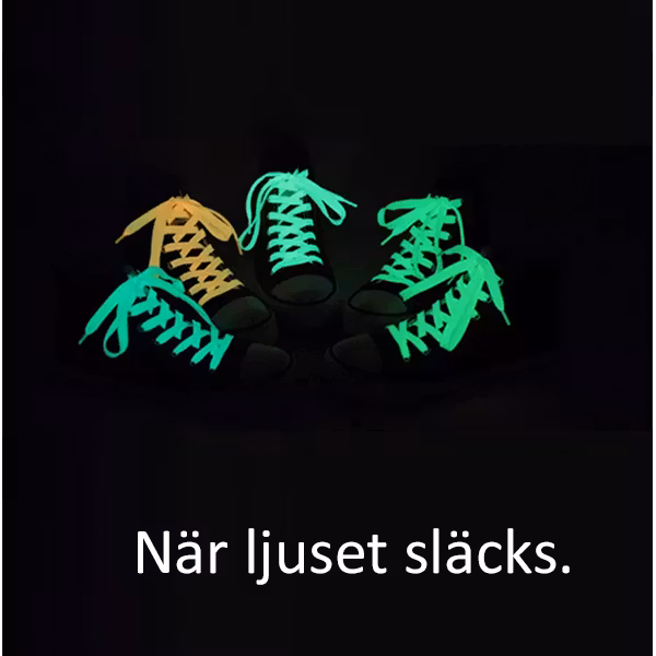 Kengännauhat, jotka loistavat pimeässä. Näitä upeita kengännauhoja on saatavilla useissa eri väreissä ja ne sopivat erinomaisesti halutessasi näkyä tanssilattialla tai juhlissa. Kengännauhat imevät itseensä valoa lampun palaessa. Kun lamppu sammutetaan, nauhoista tulee itsevalaisevat.