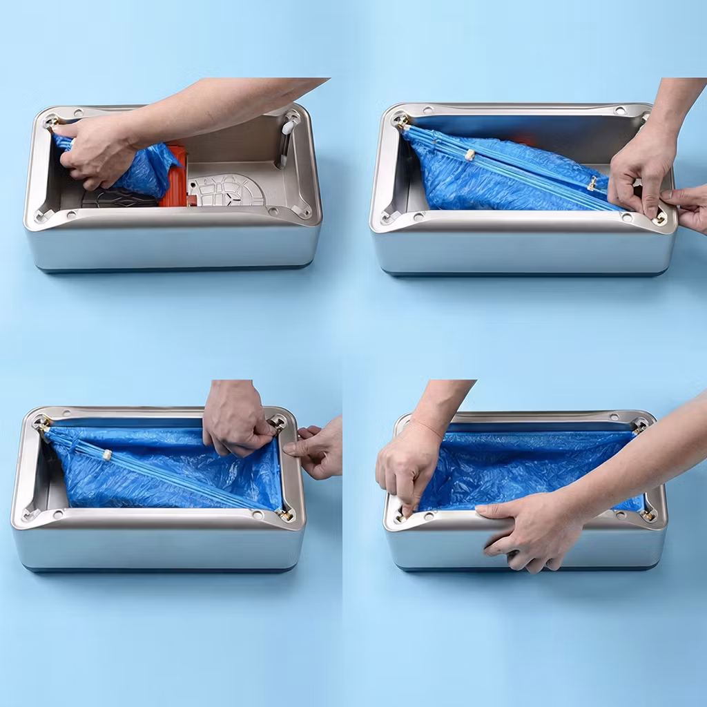 Uusien suojien asentaminen annostelijaan on yksinkertaista ja nopeaa. Avaat vain pussin ja kiinnität sen kulmista paikalleen. Tämän jälkeen laite on heti valmis käyttöön.