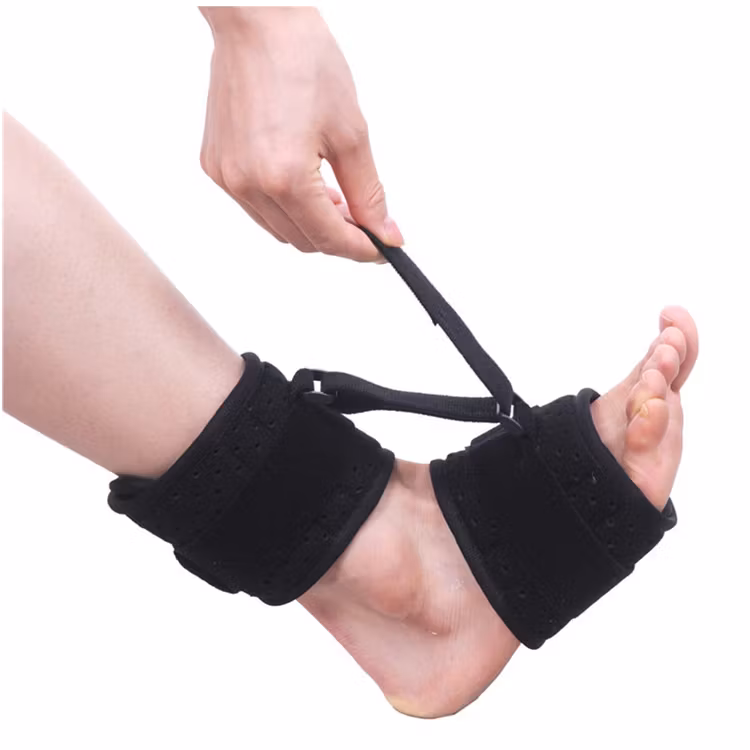 Tämän riippunilkkatuen avulla voit asettaa jalkaterän oikeaan asentoon, vaikka sinulla olisi kengät jalassa. Kiinnitä yksinkertaisesti tarranauha kengännauhojen ympärille (katso kuva) ja säädä sitten jalkaterä haluaamasi kulmaan tarranauhan avulla.