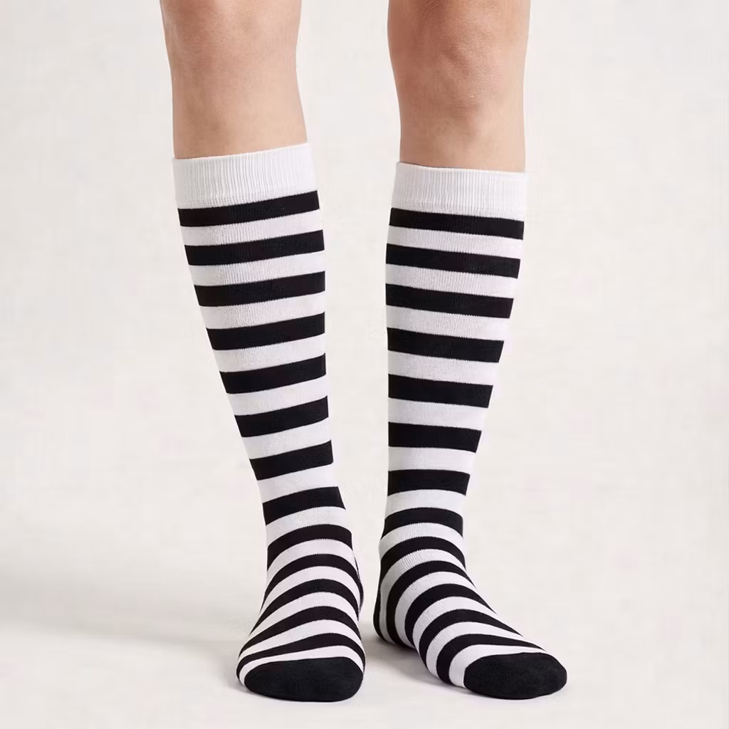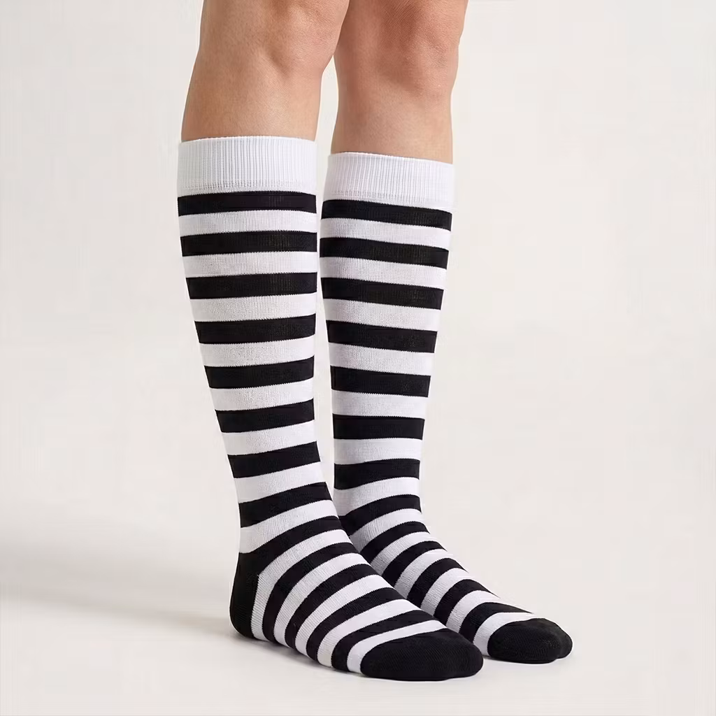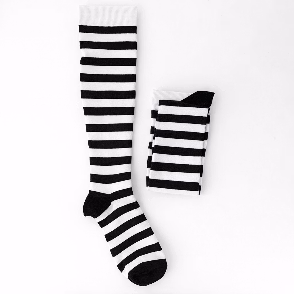 Mustavalkoraidalliset tukisukat, jotka auttavat parantamaan jalkojen ja säärien verenkiertoa. Tukisukat ehkäisevät muun muassa suonikohjujen muodostumista ja vähentävät vammautumisen riskiä treenatessa sekä auttavat pitämään verenkierron käynnissä esimerkiksi lentomatkojen aikana.